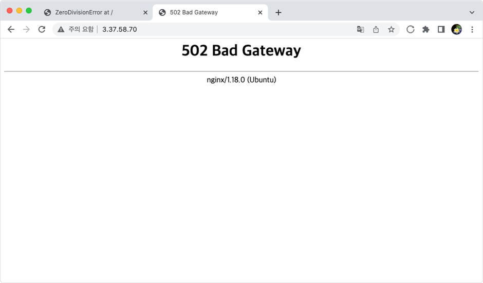 만약 logs 디렉터리를 생성하지 않고 Gunicorn을 재시작하면 다음과 같은 502 오류가 발생한다.