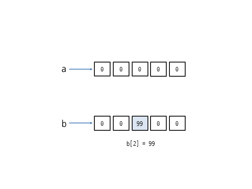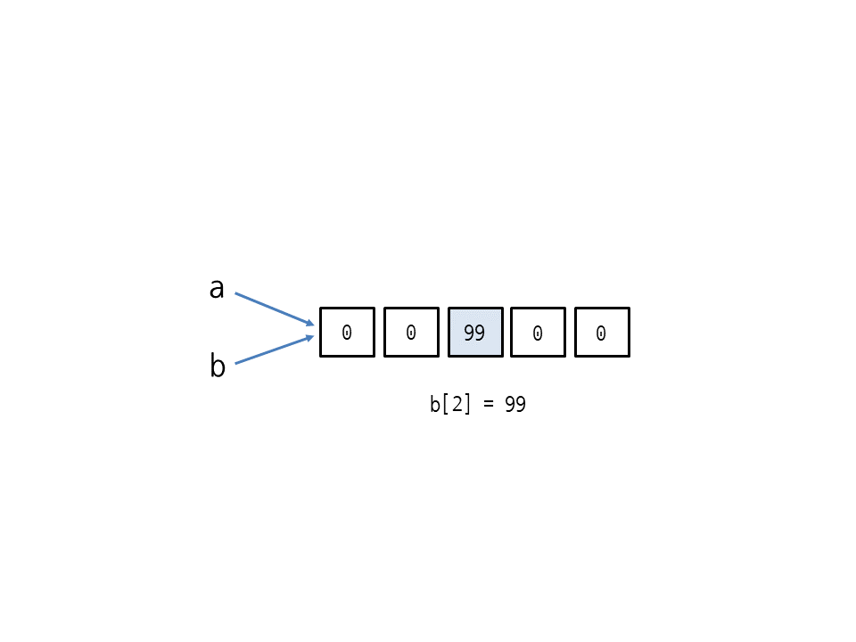 a와 b는 같으므로 b[2] = 99와 같이 리스트 b의 요소를 변경하면 리스트 a와 b에 모두 반영됩니다.