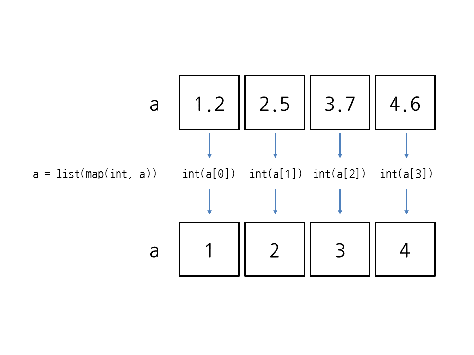 a = list(map(int, a)) 한 줄로 변환이 끝났습니다. map에 int와 리스트를 넣으면 리스트의 모든 요소를 int를 사용해서 변환합니다. 그다음에 list를 사용해서 map의 결과를 다시 리스트로 만들어줍니다.