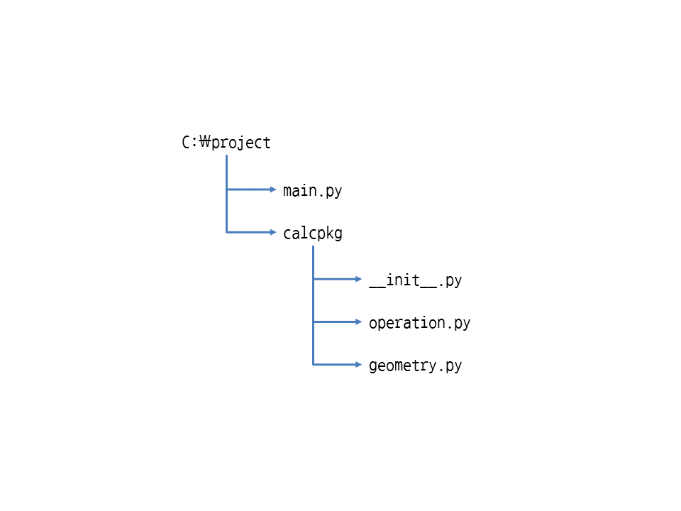 예를 들어서 다음과 같이 calcpkg 안에 operation과 geometry 하위 패키지가 있고, 그 아래에 모듈이 들어있습니다.