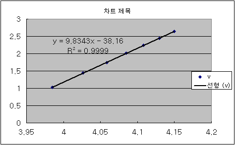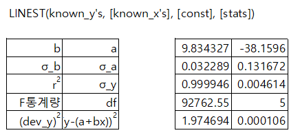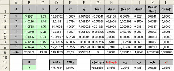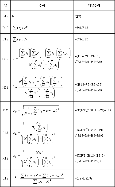 녹색 셀에 측정 데이터를 입력하면, 자동적으로 a (y-절편)과, b (기울기)가 계산되고,