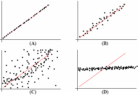 (A)는 r=1 이며, (B)는 r 값이 1에 가깝고, (C)는 r 값이 0 에 가까우며, (D)는 r=0 이다.