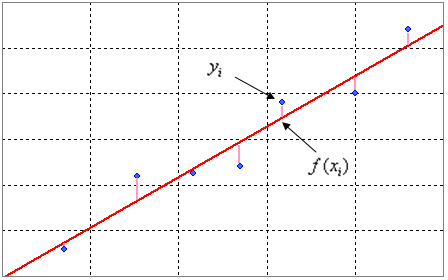 이렇게 해서 구해진 함수 y=f(x)는 이 측정값들의 관계에 가장 적합한 함수라고 할 수 있다. 이해를 돕기 위해 다음의 그림을 살펴보자.