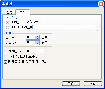 [옵션] 탭에서 수식을 차트에 표시 및 R-제곱 값을 차트에 표시를 체크한 후 확인을 누른다.