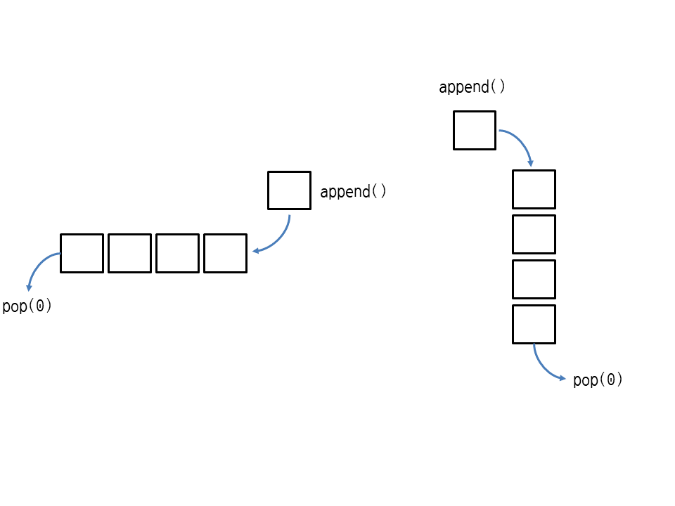 지금까지 알아본 리스트의 메서드로 스택(stack)과 큐(queue)를 만들 수 있습니다. 다음과 같이 append와 pop을 호출하는 그림을 90도 돌리면 스택의 모습이 됩니다.